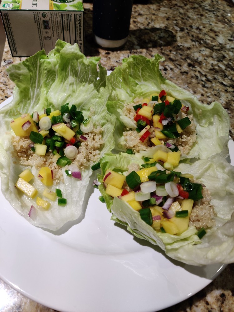 I got a wild hair yesterday and decided to try a recipe I’d been working on in my head. Mango salsa lettuce wraps with quinoa. I have to say it was good, really good for a first attempt and a creative recipe. I think it lacked some type of sauce, tamari or something might help it a tiny bit because the grain takes something to make it work. Claire and I talked about making the salsa the main draw and using the quinoa as more of a garnish, but even then it lacks a light sauce or something to help it along. Possibly a tiny bit of sea salt and fresh lime juice would have really brought this to life. There’s something magical about the mango and jalapeno coming together to make a sweet and spicy though, and that salsa works! Mango, red onion, jalapeno, serrano and scallion. So good!